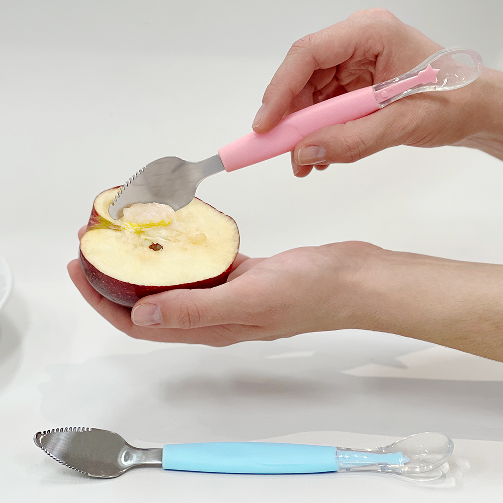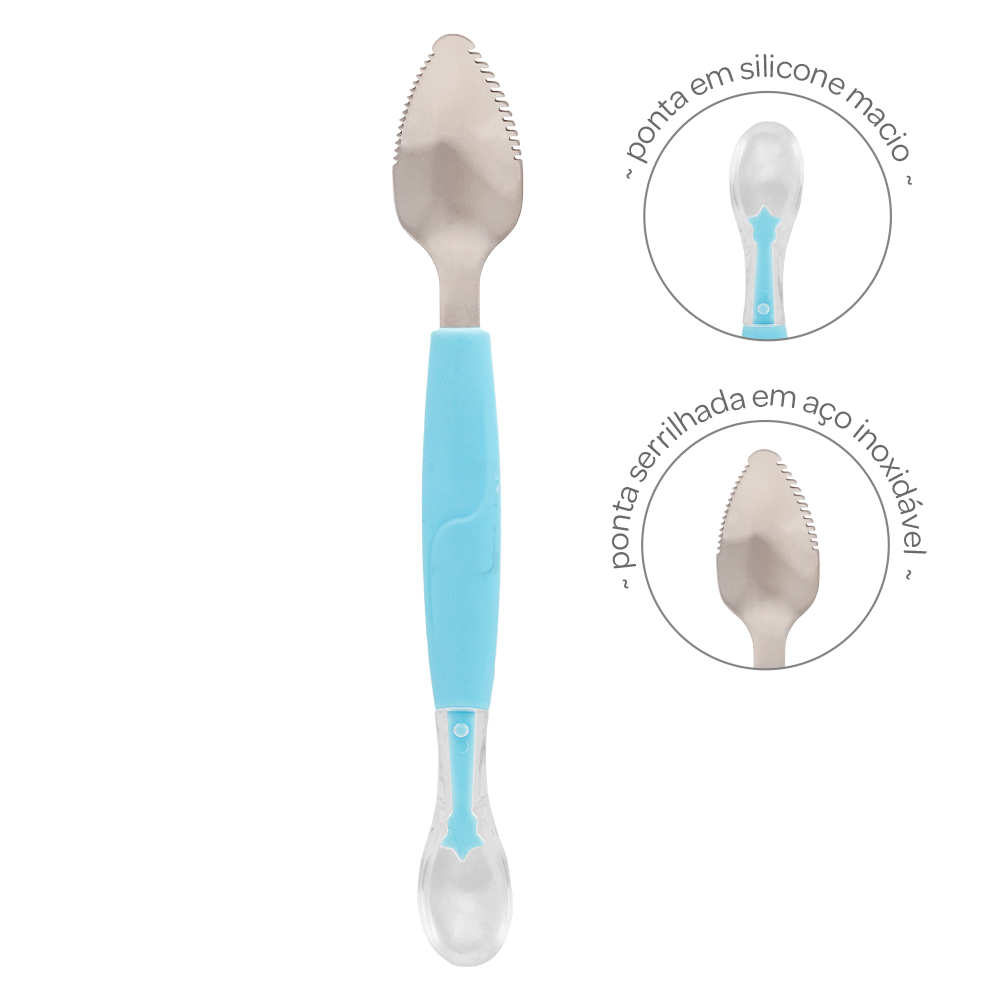 Duas extremidades pensadas para diferentes usos: inox para raspar e pegar alimentos, silicone macio para alimentar com segurança.
