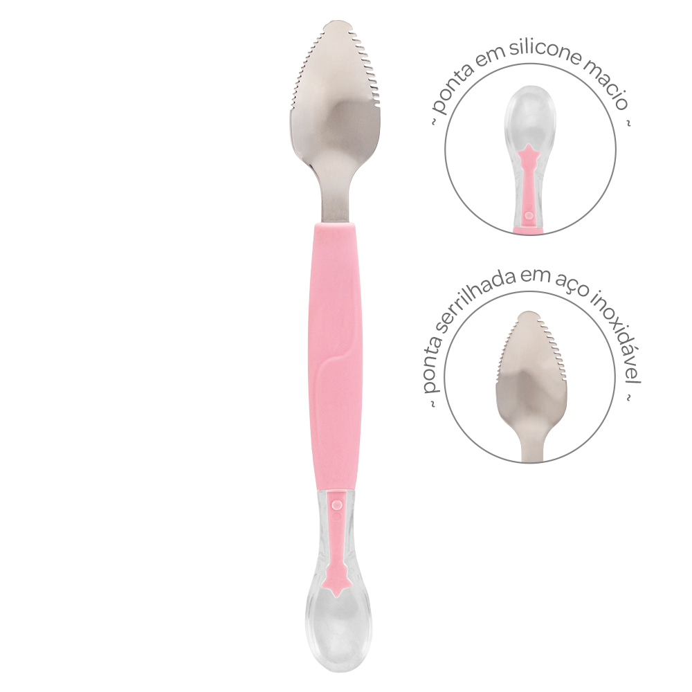 Duas extremidades pensadas para diferentes usos: inox para raspar e pegar alimentos, silicone macio para alimentar com segurança.