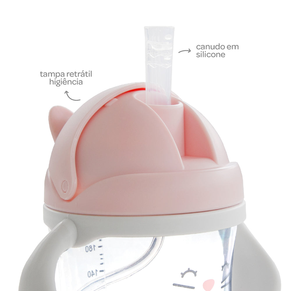 O Copo com Canudo e Dispositivo Gatinho Rosa Buba combina funcionalidade, segurança e um design encantador, ideal para incentivar o bebê a beber com autonomia e alegria.