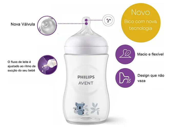 - O bico Natural Response é inovador e permite que o bebê controle o fluxo de leite, com uma válvula que interrompe totalmente o fluxo quando o bebê para de sugar.